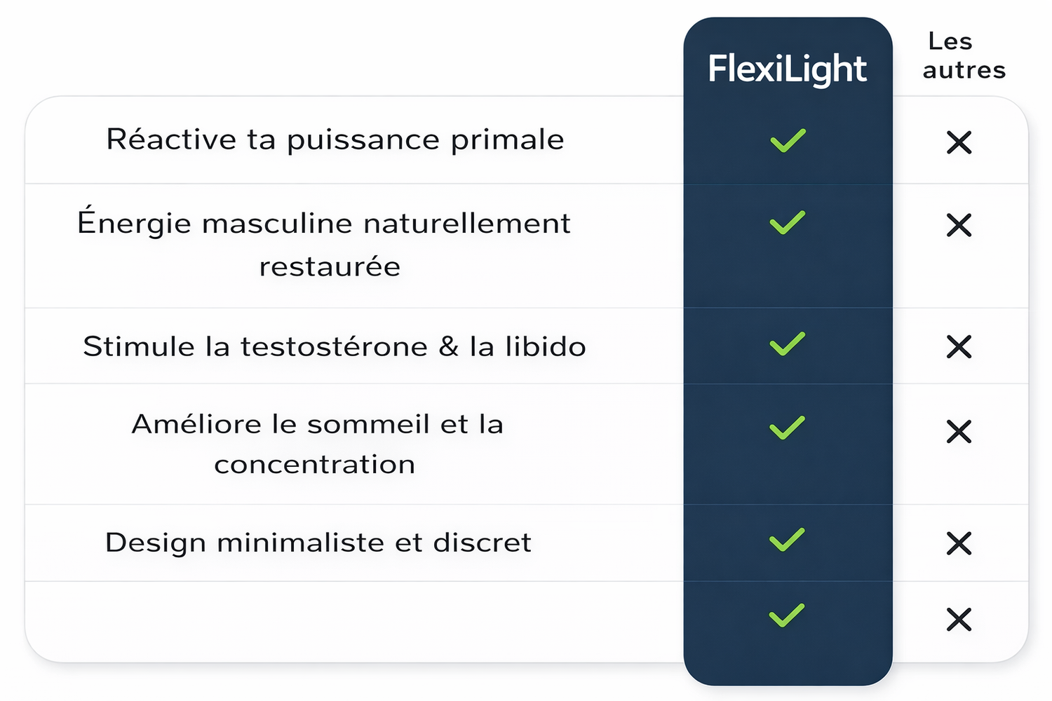 Alors que les compléments provoquent des pics et des chutes d’énergie, Flexilight offre une stimulation magnétique constante. Les hommes rapportent une concentration accrue, une énergie durable, une libido renforcée et un regain de confiance masculine, les aidant à devenir l’homme qu’ils étaient destinés à être.